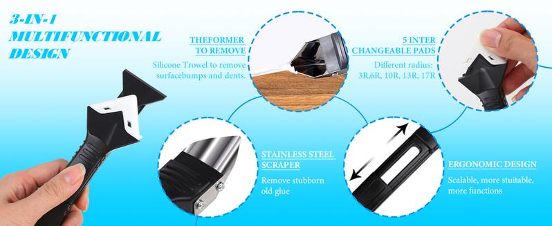 3-in-1 Sealing Pro System Integrates: corner finisher/glass glue blade/adhesive scraper/seam repairer. Single-tool solution for gap refinement and residue removal.