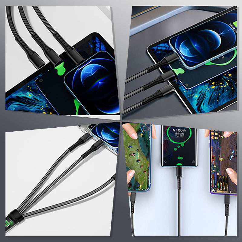 3 IN 1 CHARGING CABLE - This cable allows you to charge multiple devices simultaneously, saving you time and eliminating the need for multiple cables. Whether you have an iPhone, Android, or Type-C device, this cable has got you covered, ensuring efficient charging without any slowdowns.