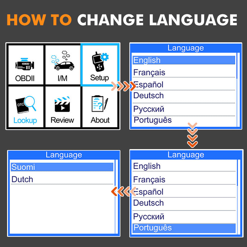 MULTI-LANGUAGE SUPPORT: This diagnostic scanner features support for multiple languages including English, French, Spanish, German, Russian, Portuguese, Dutch, and Finnish. This ensures ease of use and accessibility for users around the world, accommodating various language preferences and enhancing user experience.