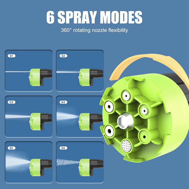 6 SPRAY MODES – Featuring a 360° rotating nozzle with six spray modes, the washer gun adapts to different cleaning needs instantly. From a narrow jet for stubborn dirt to a wide spray for larger surfaces, users can switch modes with one hand for convenience. This flexibility provides both precision and versatility in every cleaning scenario.